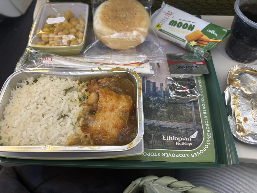 On our second flight from Addis Ababa to Nairobi, we had dinner. I was eager to see what we were having. It was between chicken or beef, and seeing as though I’d just had beef for lunch, I decided to go for chicken. Dinner was Chicken, rice and a chickpea salad, with another bread roll. We were also given some cookies for dessert.